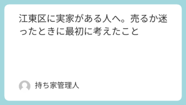 地域別|実家・不動産の話 江東区に実家がある人へ。売るか迷ったときに最初に考えたこと 実家のことを考え始めると、住んでいる地域によって、悩みの中身は少しずつ違ってきます。たとえば、江東区周辺に実家がある場合。売るべきか、それともまだ残しておくべきか。簡単には決められず、しばらく考え込ん... 2026.01.18 地域別|実家・不動産の話